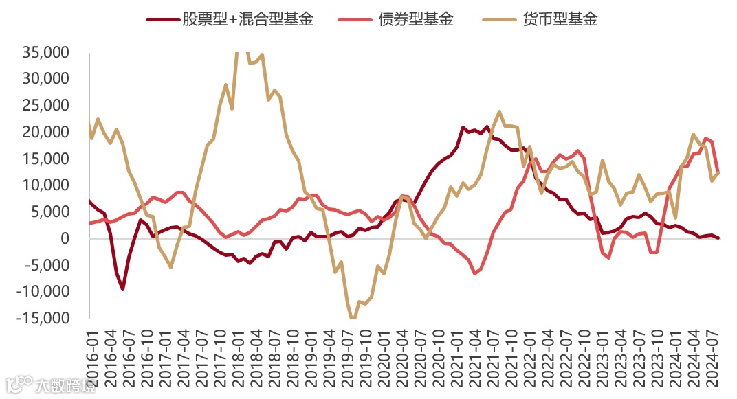 过去两年,房地产市场表现不佳和股票市场持续震荡,债券成为最受关注的投资品种,其次为现金。2022年以来,我国居民存款余额从103万亿增加到了147万亿,2024年1-8月居民存款净增长9.6万亿,仍居于历史高位。有资产配置需求的资金更多地拥挤在货币或债券型基金里,而权益资产的流动性显著转弱,股基赎回压力大。