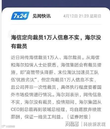 4月12日,海信集团发布一则说明称,受疫情影响,家电行业海内外市场均出现大规模下滑,海信海外业务收入比例占到集团整体收入的40%,经营形势严峻,采取高管带头降薪、通过末位淘汰加速员工队伍等措施激发全体员工斗志,层层传递压力、提高效率,以稳住业绩。此后,海信还向外界辟谣了裁员1万人的传闻。