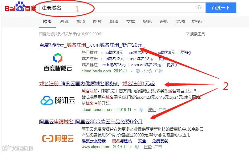 百度 、阿里云、腾讯云、华为云、美橙、西部数码、聚名网等等。