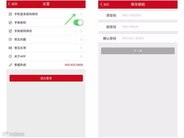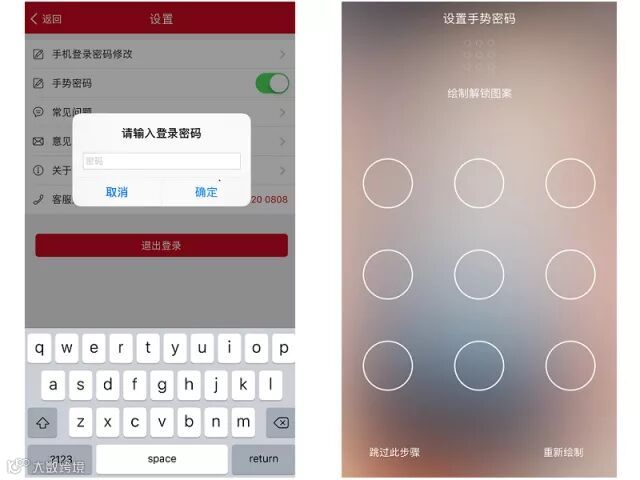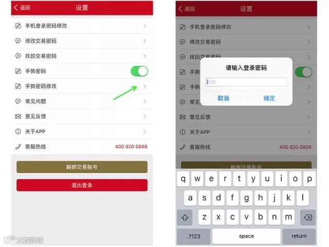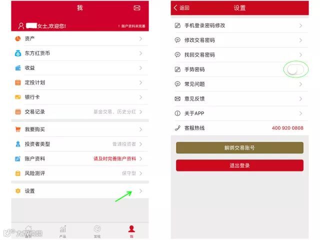 打开东方红APP,点击底部“我”栏目,进入“设置”页面,点击“手势密码”按钮,在跳出来的对话框中输入登录密码,绘制手势密码。