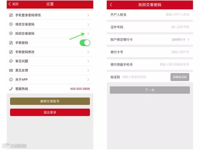 进入“设置”页面,点击“找回交易密码”,依次填入信息,手机验证后,设置新的交易密码,设置完成后交易密码即可成功找回。