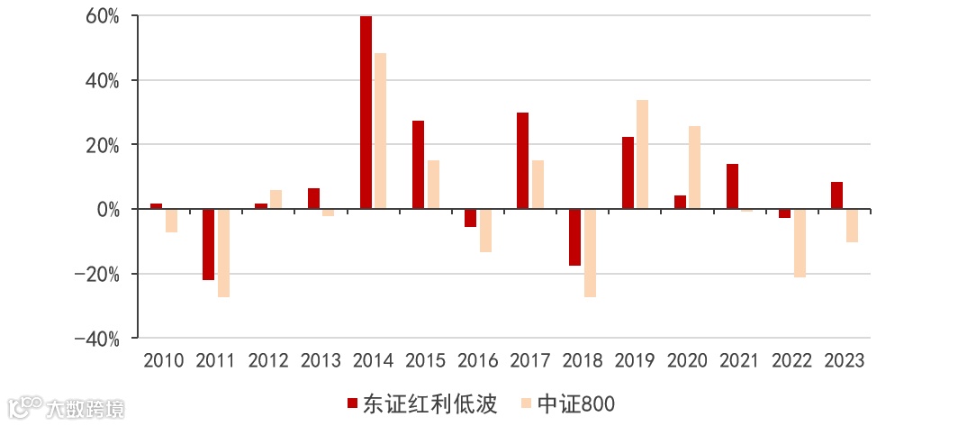 从年度收益表现观察,从2010年以来,东证红利低波指数确实在大部分年份跑赢中证800,尤其是在中证800下行的年份,东证红利低波均取得了相对更佳的表现。