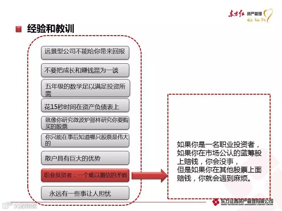 “另外,职业投资者还有一个最重要的规则。如果你是一名职业投资者,如果你在市场公认的蓝筹股上赔钱,你会没事,但是如果你在其他股票上面赔钱,你就会遇到麻烦。