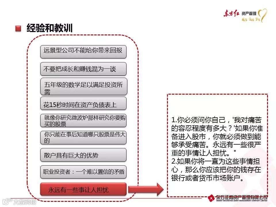 “最后一个需要考虑的因素是永远有一些事让人担忧。你必须问你自己,‘我对痛苦的容忍程度有多大?’如果你准备进入股市,你就必须做到能够承受痛苦。永远有一些很严重的事情让人担忧。”