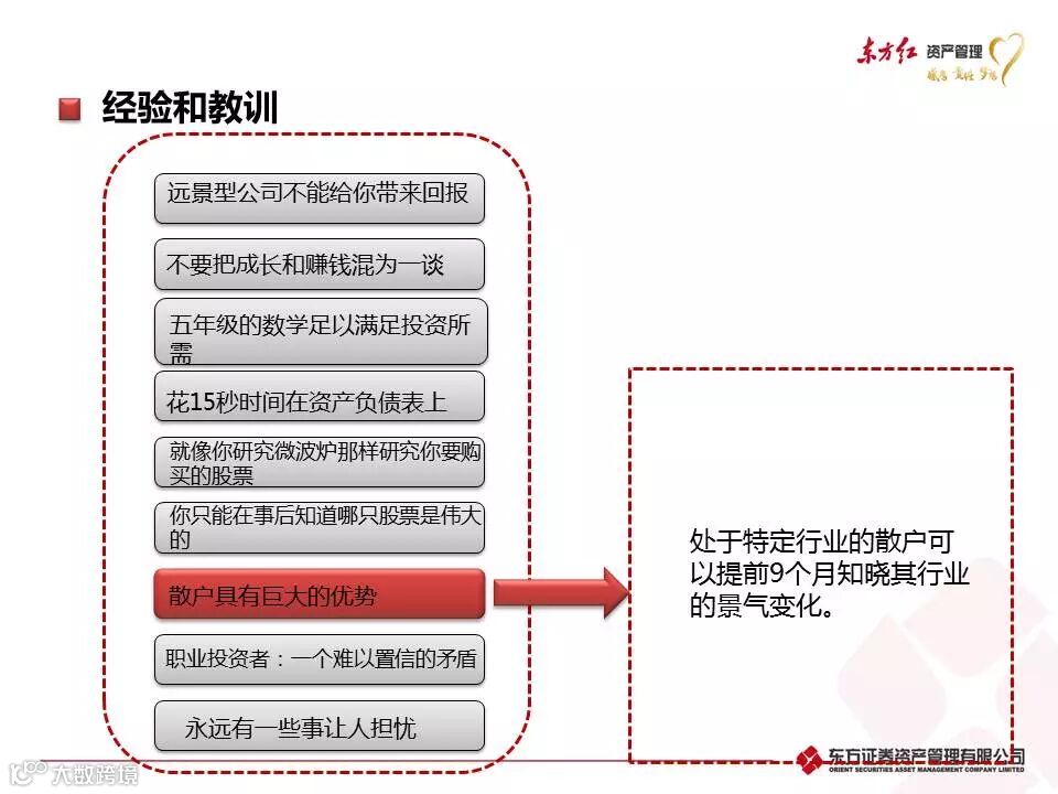 “在股票投资方面,散户绝对具有难以置信的优势。有些散户在化工行业工作,有些则在造纸行业就业。他们将比我提前9个月获悉化工行业的景气状况变化。他们能最先知道氯出现了短缺。他们可以率先知道腐蚀剂缺货。他们能第一时间知道库存销售完毕。但是他们却去买生物工程类股票。”