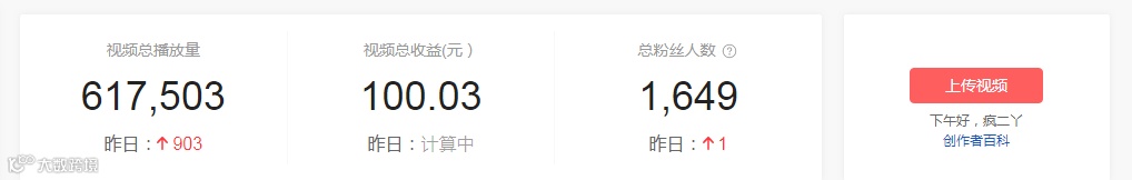 成绩:视频总收益100元;收获粉丝1649;总播放量达617503;总播放时长为640658;