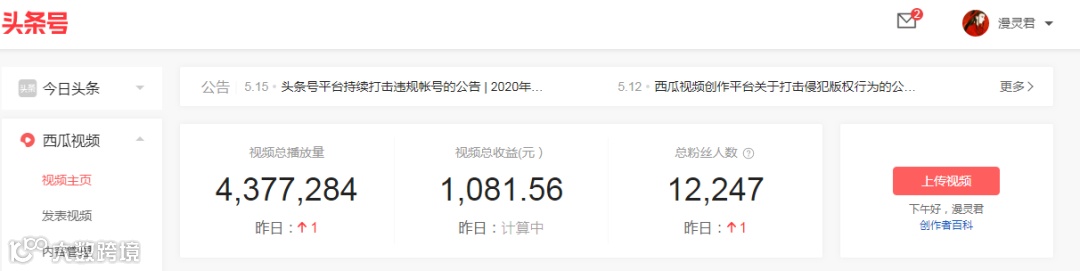 成绩:视频总播放量4377284;平台总收益1081元;粉丝数12247;累计阅读量706763。