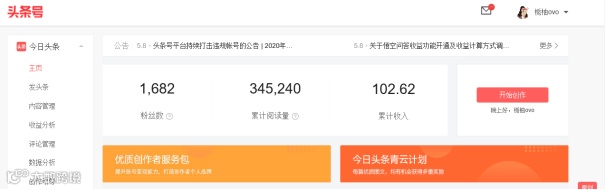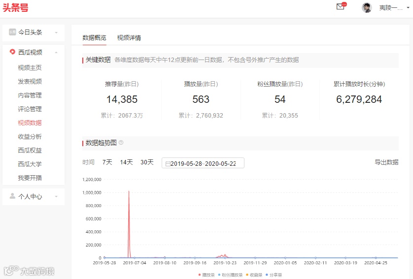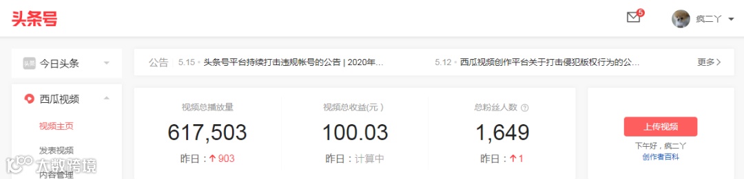 成绩:累计收入:3068.69元;粉丝数:23,120;累计阅读量:1332.9万;西瓜视频总播放量:2760932。