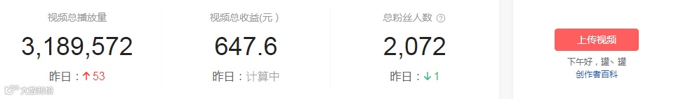 成绩:视频总收益647元;收获粉丝2072;总播放量达3189572;一共含有215条视频作品;总播放时长为3492484。