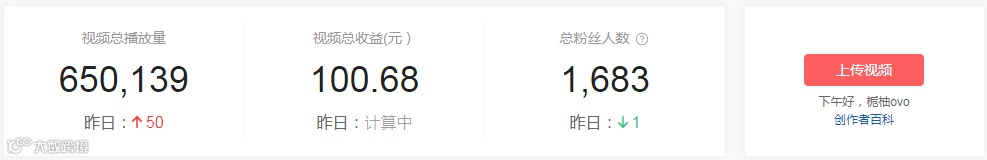 成绩:视频总收益100元;收获粉丝1683;总播放量达650139;总播放时长为680,769;