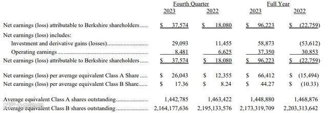 2023年全年,伯克希尔·哈撒韦实现净利润962.23亿美元,上年同期净亏损227.59亿美元;运营利润为373.50亿美元,而上年同期运营利润为308.53亿美元。