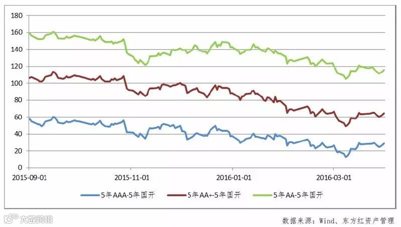 2、信用利差极度压缩:市场的分歧在利率债上表现更为充分,而受制于较强的配置需求,机构操作转向票息策略,信用债在一季度表现突出,信用利差被不断压缩。此外,受益于房地产相关去库存政策,地产销售大幅回升,地产企业业绩改善明显,地产债在本季度表现极为抢眼,收益率大幅走低。