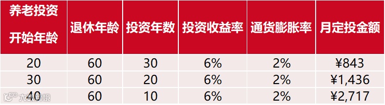 通过数据测算,在假定特定投资收益率和通货膨胀率的前提下,我们会发现,如果我们退休后想要实现100万养老目标,越早定投所需要的月定投金额越低。