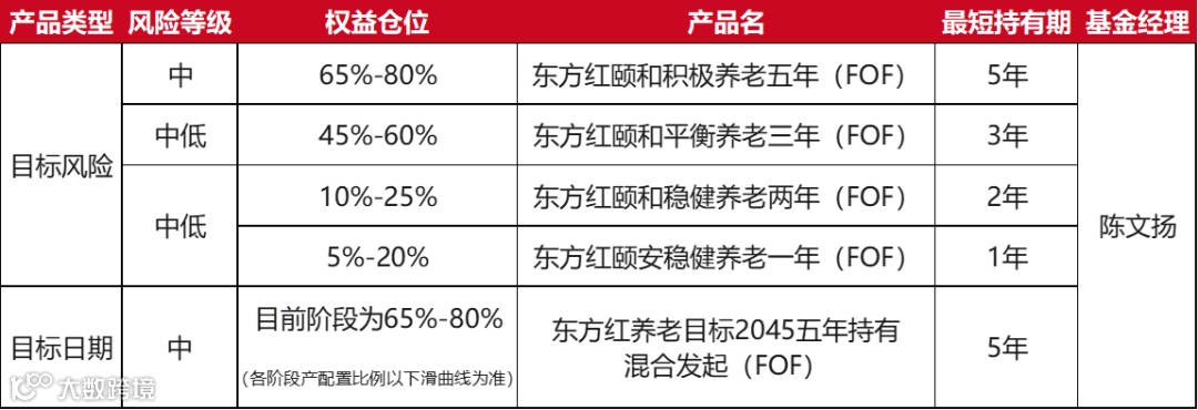 不同养老目标基金的权益仓位和风险收益特征各有差异,投资者需要定期评估自身看看自己的风险偏好或承受能力与基金产品风险等级的匹配性。东方小红在此梳理了东方红养老目标基金产品体系,如果大家发现与自身风险偏好不匹配应及时调整,选择适合自己的产品,才能更好地坚持长期投资。
