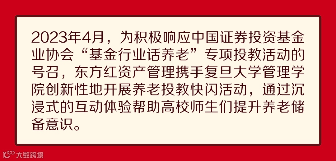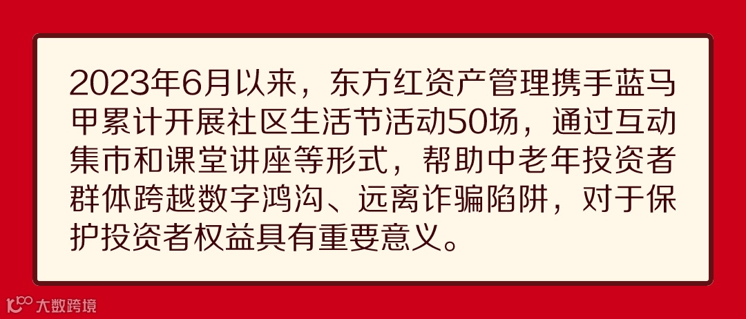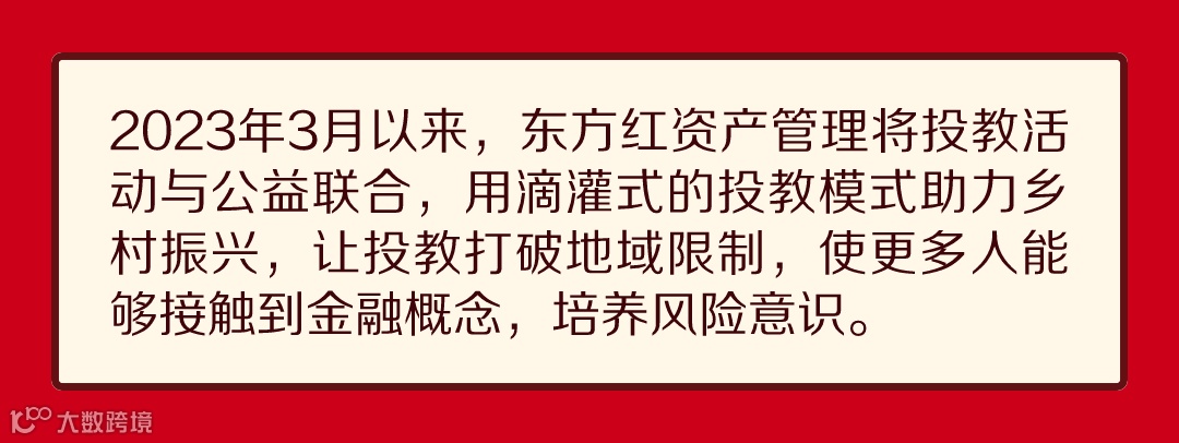 2023年以来,在中国证券投资基金业协会的指导下,东方红资产管理积极开展 “一司一省一高校”系列投教活动、“基金行业在行动——投教纳入国民教育体系”专项活动,先后走进8所学校、51个社区、88个城市,以专业、系统、持续的投资者引导与陪伴工作努力提升投资者获得感。