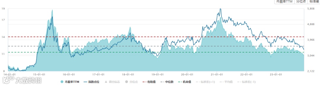 2023年12月11日沪深300指数的市盈率为10.76倍,已经低于2008年6月30日、2018年6月29日和2019年2月18日的20.26倍、11.89倍和11.51倍的估值水平。当前沪深300指数估值处于近10年12.5%分位点,即比过去10年超87%的时间都要便宜。