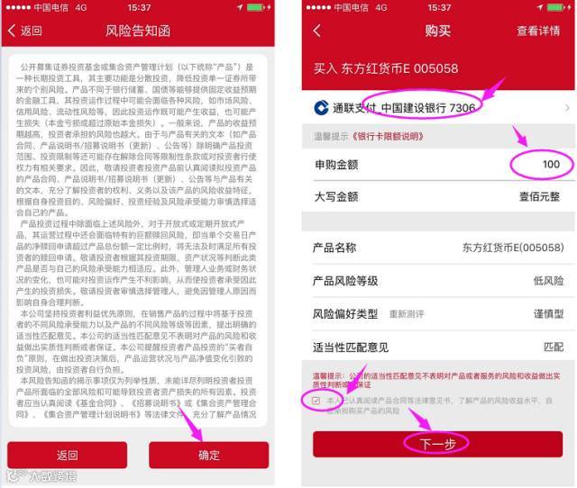 阅读“风险告知函”,输入认购金额,选择银行卡,查看适当性匹配意见,点击“下一步”