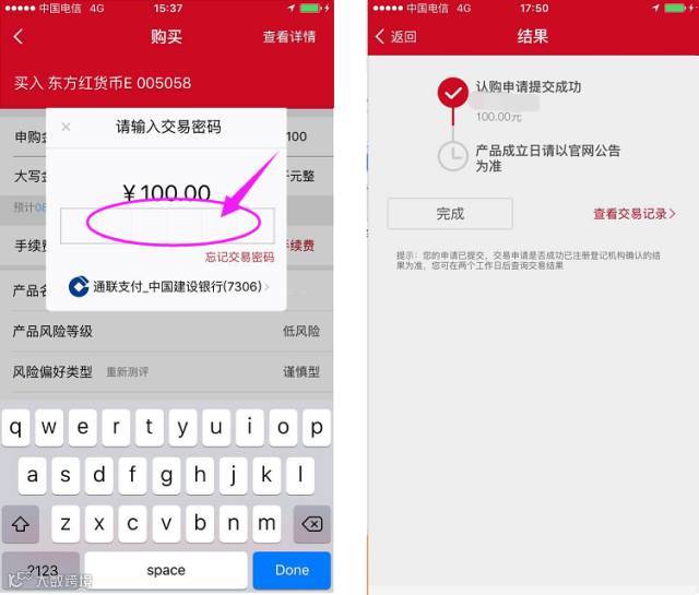 在首页新发产品处选择东方红货币E,点击“立即认购”,了解产品信息,“立即购买”!