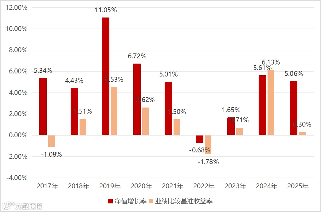 从每年的年度收益情况来看,东方红汇利也展现了较为稳健的风格。根据东方红汇利的历年年报数据显示,在2017—2025年的九个完整年度中,该基金只有在2022年微跌-0.68%,其余年份均实现正回报,为投资者提供了良好的持有体验。