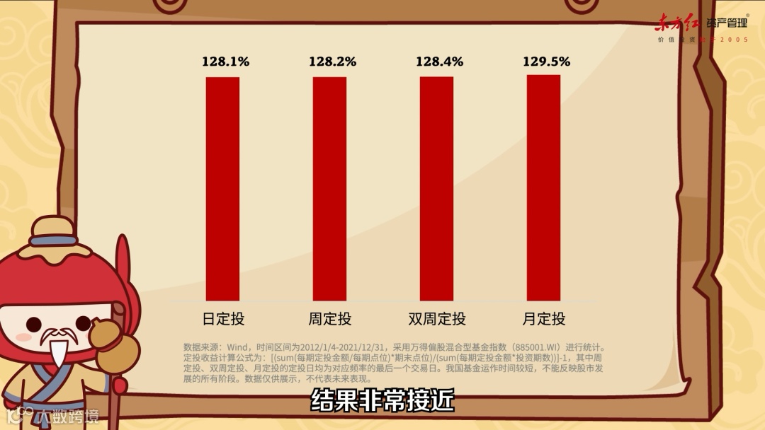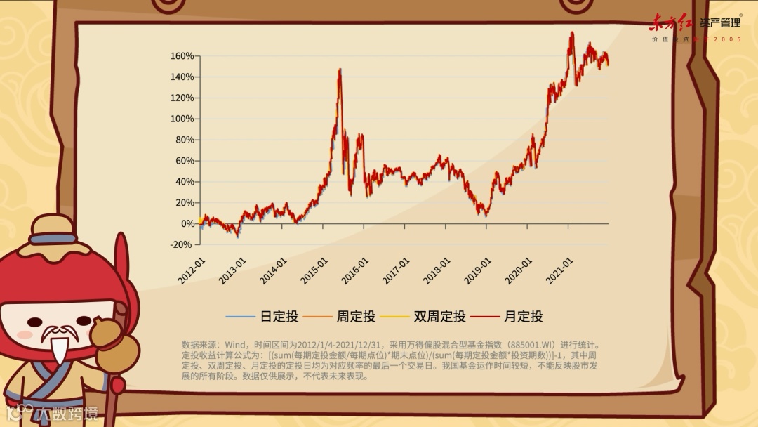 我们看下用历史数据进行回测的情况。从2012年至2021年,分别以日定投、周定投、双周定投、月定投的频率投资万得偏股混合型基金指数。可以发现,在坚持了一定的时间后,四种定投方式的收益变化高度一致,曲线走势基本是贴合的。