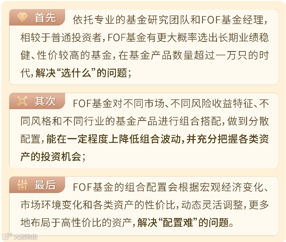 与普通基金主要投资股票、债券等不同,FOF基金80%及以上的资产用于投资公募基金产品,尽量筛选绩优基金产品,通过对不同市场、风格、行业的基金进行组合投资,可以规避单只基金在单一市场、风格、行业上风险暴露过高的问题,为投资者提供综合的资产配置方案。