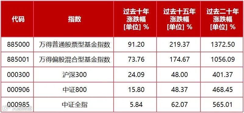 过去十五年(2011.01.01—2025.12.31),万得普通股票型基金指数(885000)涨幅达到219.37%,万得偏股混合型基金指数(885001)也有174.67%;过去二十年,万得普通股票型基金指数(885000)涨幅接近14倍,万得偏股混合型基金指数(885001)涨幅也超过10倍。