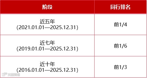 注:数据来源于国泰海通证券基金评价与研究中心于2026年1月4日发布的《基金公司权益及固定收益类资产业绩排行榜》,截至2025年12月31日。纯债类基金绝对收益率近10年排名10/35,近7年排名15/94,近5年排名28/117。