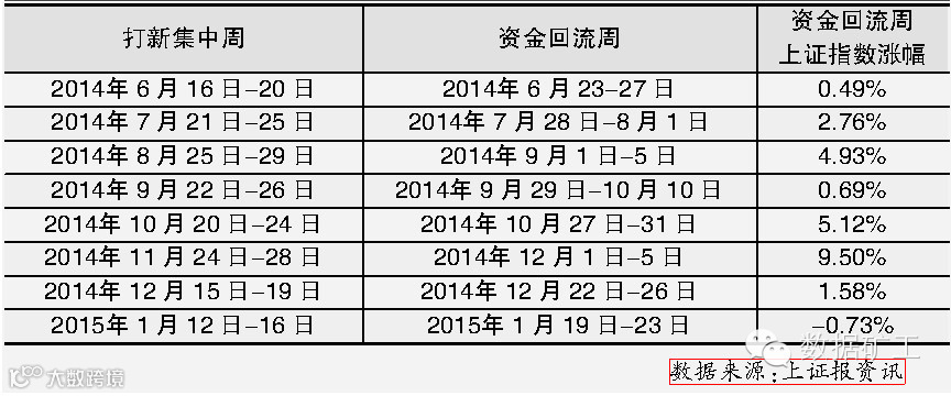 同理类推,去年8月份新股发行后的资金回流周指数涨幅为4.93%;9月份的资金回流周指数涨幅为0.69%;10月份的资金回流周指数涨幅为5.12%;11月的资金回流周指数涨幅为9.5%;12月的资金回流周指数涨幅为1.58%。
