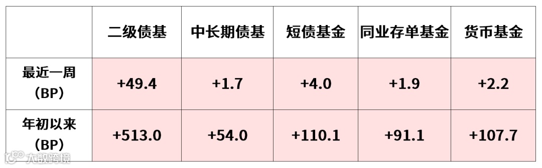 注:数据来源于Wind,口径截至2025.10.26。其中二级债基、中长期债基、短债基金、同业存单基金、货币基金分别对应万得混合债券型二级基金指数(885007.WI)、万得中长期纯债型基金指数(885008.WI)、万得短期纯债型基金指数(885062.WI)、万得同业存单基金指数(885045.WI)、万得货币市场基金指数(885009.WI)。债券利率上行,对应着债券价格下跌,意味着固收类产品的净值趋于震荡或下滑,投资收益下降。反之,债券利率下行,对应着债券价格上涨,意味着固收类产品净值上行,投资收益上升。基金净值上涨1BP=上涨0.01%。
