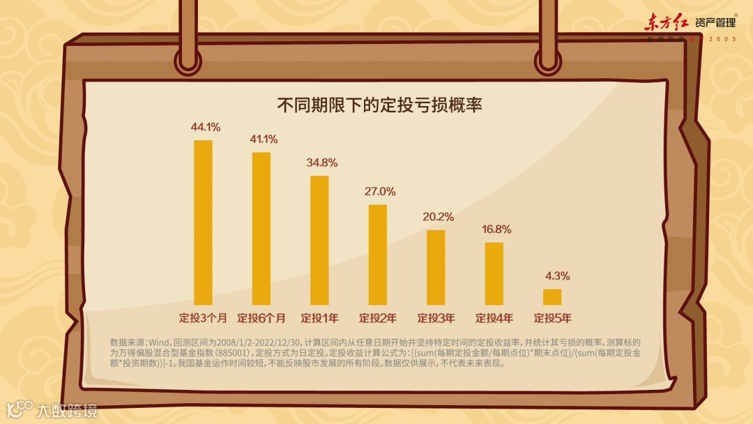 然而,定投时限较短,可能会影响整体投资盈利体验。在定投刚开始的阶段,亏损的概率其实是比较高的,但如果能将定投坚持下去,即便前期出现亏损,后续也很可能扭亏为盈。当定投坚持5年以上时,亏损概率将降低至5%以下。