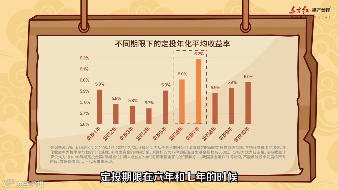 所以参考市场周期的节奏,坚持定投六七年以上,更有可能相对完整地穿越牛熊,抹平难以预测的短期波动,更好地分享市场的长期成长。
