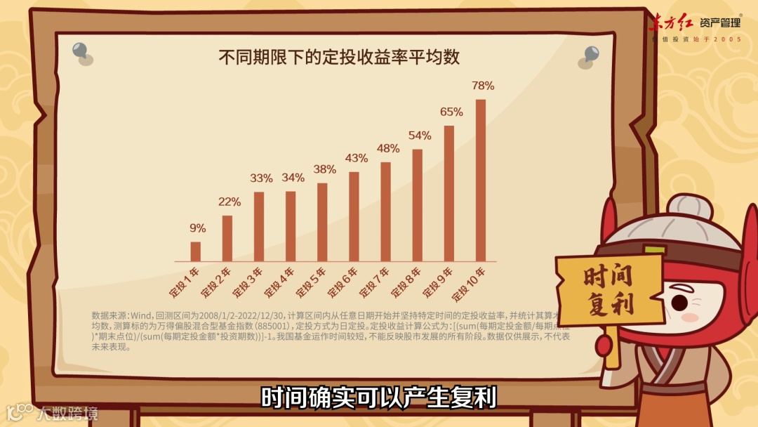 一般而言,定投是一种长期投资方式,投资时间不宜太短。如果坚持的时间不够长,定投次数较少,很难发挥均摊成本的作用,存在较高的择时风险。另外,每期定投的资金量通常较小,短期内积累的筹码不多,即便市场有不错的表现,盈利水平也非常有限。