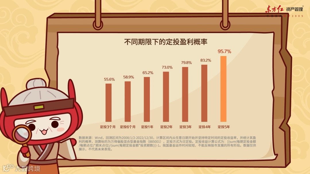 回测结果显示,随着时间的拉长,定投获得正收益的概率将稳定地上升。如果坚持时间在5年以上,定投的胜率将超过95%,通过定投盈利已经是确定性较高的事情。