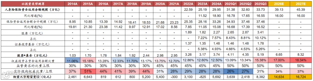 在当前市场环境下,保险资金仍面临一定的资产配置压力。随着资产负债管理新规强化对投资收益率覆盖率的刚性要求,在利率债难以完全覆盖负债成本的情况下,向权益“要收益”成为必选项。2025年前三季度,险资权益配置已贡献约1.44万亿元增量。基于行业资产规模16%的年化复合增长率,如果权益配置比例在2026年和2027年分别提升至17%、18.3%,预计或将为市场注入1.46万亿和1.67万亿的增量资金。