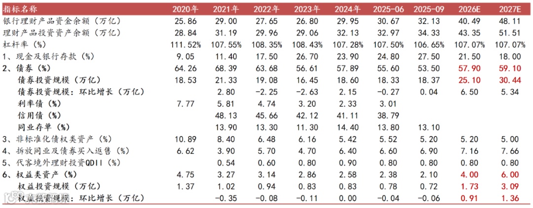 银行理财方面,权益资产配置比例有望上升。适度增配权益资产是破解理财收益困境的有效路径。截至三季度,权益类资产在理财持仓中的占比仅为2.10%,处于历史极低水平。若理财产品权益投资比例逐步提升至4%、6%,预计2026年、2027年可为权益市场带来约9051亿元、1.36万亿元的增量资金。