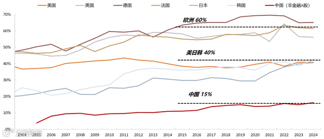 随着中国制造业深度嵌入全球价值链,A股盈利周期与国内经济周期相关性逐步减弱,非金融A股的海外营收占比已从2009年的8.6%提升至2024年的16.3%,A股海外收入系统性提升。其中,54%公司具备海外创收能力,这些公司的外销占比已达到23.3%。
