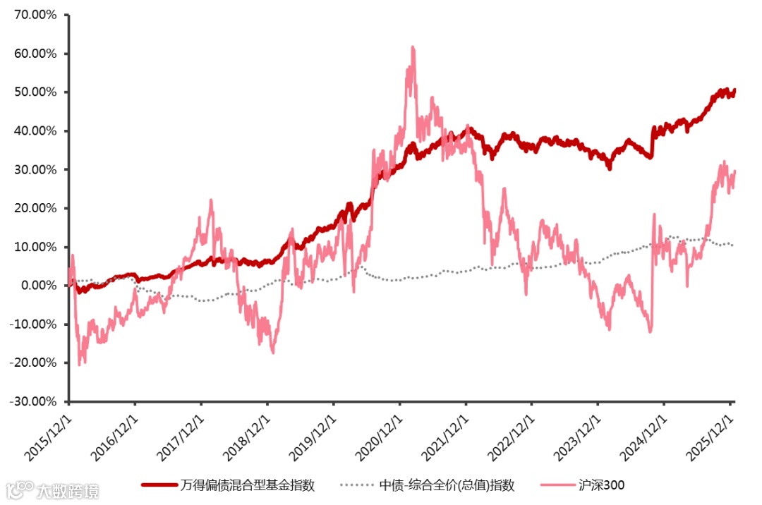 作为“固收+”典型代表指数之一的偏债混合型基金指数在近年震荡的行情中表现突出,配置价值逐渐被市场认可。Wind数据显示,截至2025年12月1日,过去十年(2015.12.1-2025.12.1)偏债混合型基金指数(885003)上涨了49.62%,对比中债-综合全价(总值)指数以及沪深300指数有较明显的长期收益优势。在波动率方面,偏债混合型基金指数波动率为3.66 %,大幅低于沪深300指数18.33%的水平,实现了“低回撤+稳回报”的良好走势。