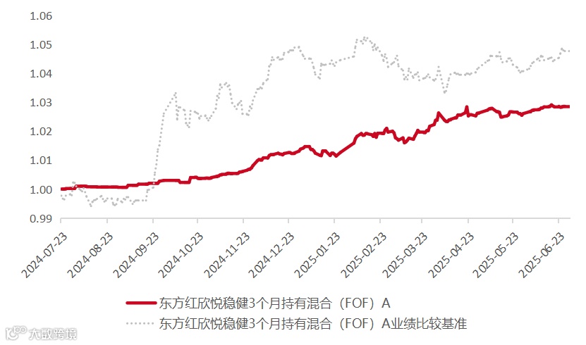 图:东方红欣悦稳健3个月持有混合(FOF)A累计净值与同期业绩比较基准走势对比图