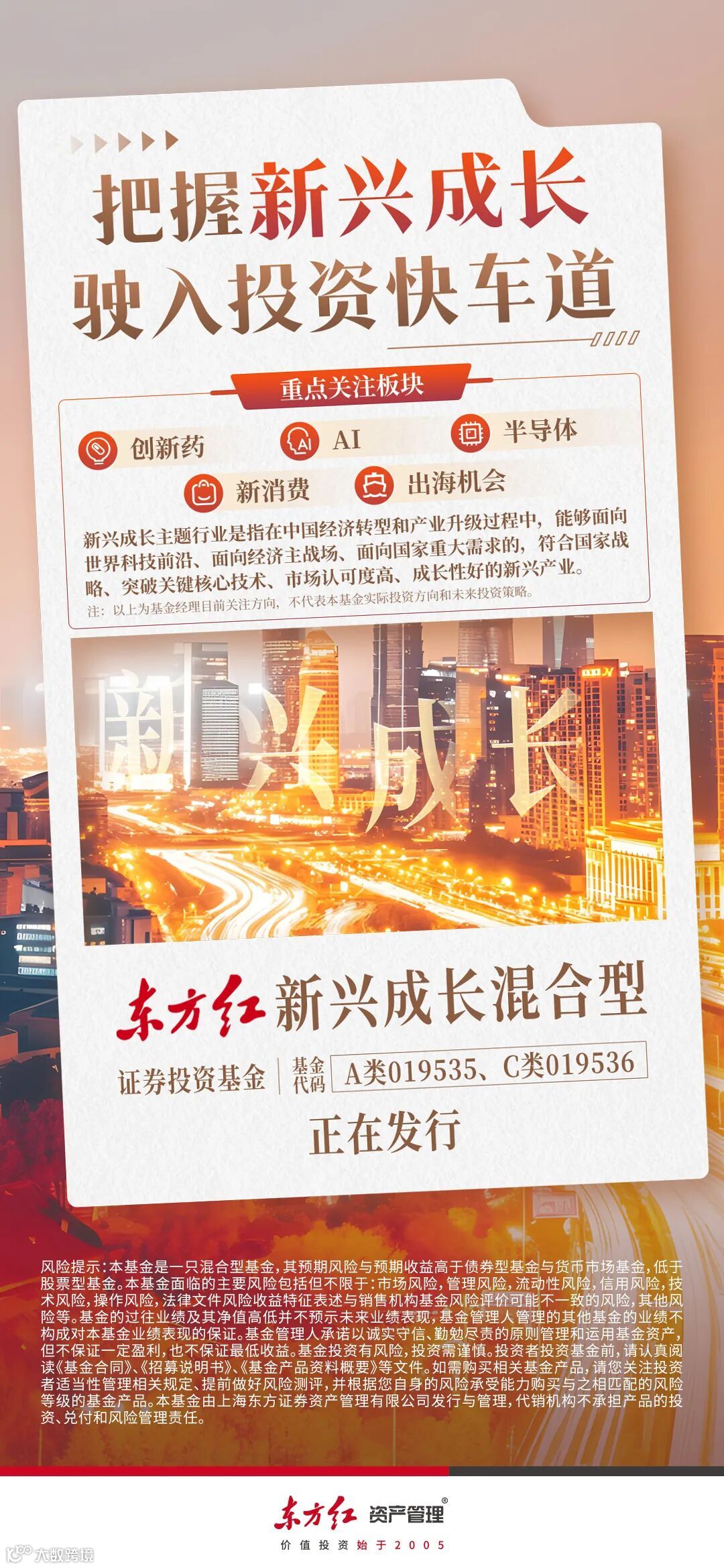 新兴产业、未来产业,正在蓬勃发展。如何紧跟时代的步伐,更好地投资新兴成长领域?选择正在发行的东方红新兴成长混合基金(A类019535、C类019536),一起前行!