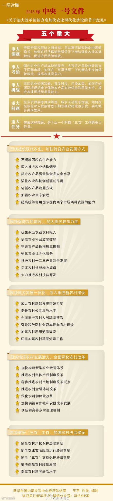 2015年中央一号文件,《中共中央国务院关于加大改革创新力度加快农业现代化建设的若干意见》近日正式发布。这是中央一号文件连续第12年聚焦“三农”。