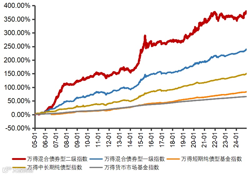 Wind数据显示,长期以来二级债基整体风格表现稳健,同时收益明显高于纯债基金。万得混合债券型二级指数(代码885007)近20年(2005.1.1——2024.12.31)累计涨幅大幅超过万得中长期纯债型基金指数(代码885008)、万得短期纯债型基金指数(代码885062)和万得货币市场基金指数(代码885009)。
