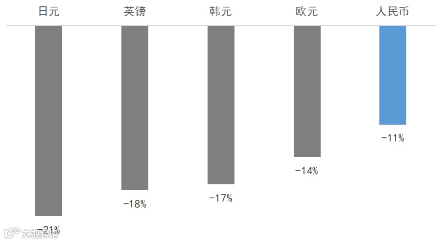 在美元指数急剧上涨之下,世界主要经济体货币兑美元的汇率都存在较大跌幅。截至9月30日,今年以来日元兑美元贬值21%,英镑兑美元贬值18%,韩元兑美元贬值17%,欧元兑美元贬值14%。