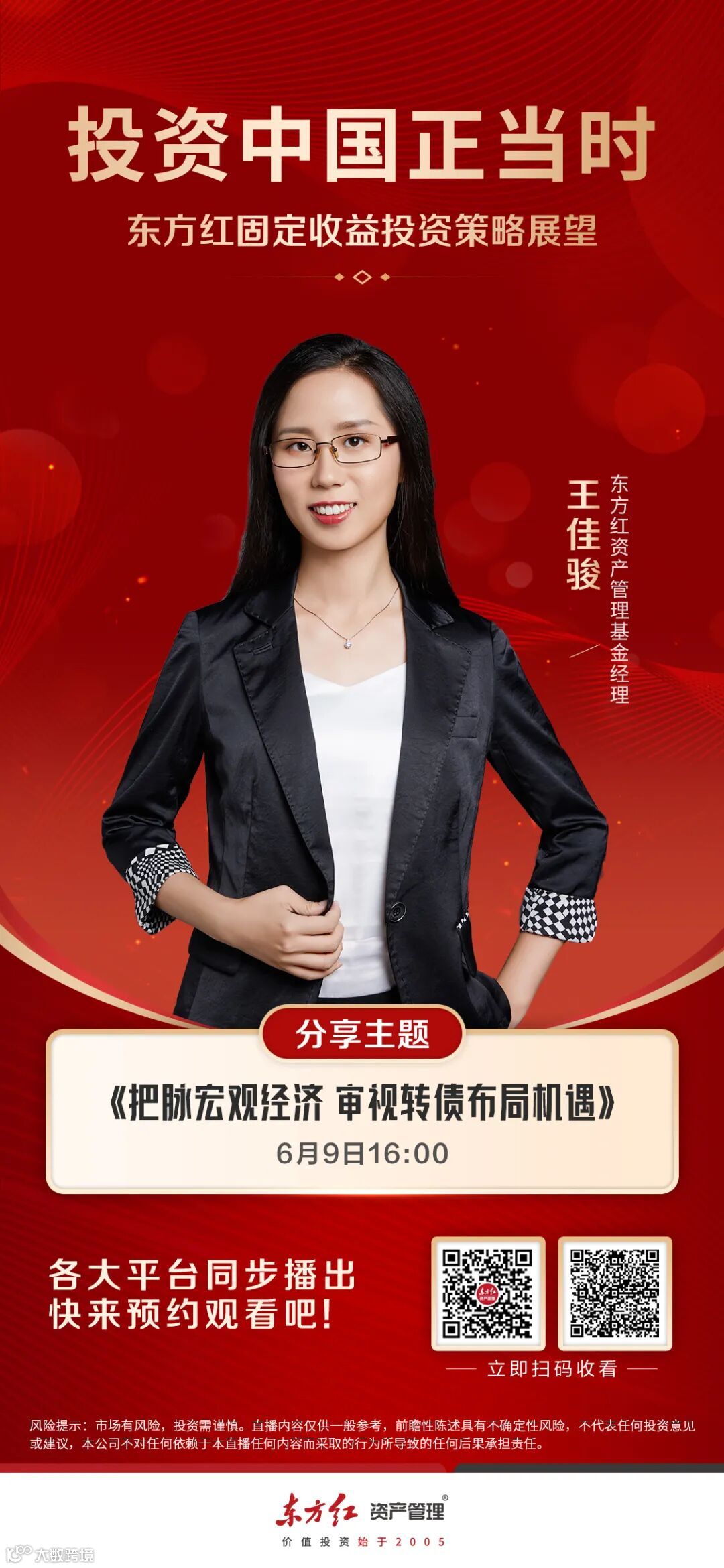 第二期直播将于6月9日下午16:00开始,由东方红固定收益投资部基金经理王佳骏女士为投资者带来主题为《把脉宏观经济 审视转债布局机遇》的最新解读和行业分析。欢迎一键预约!