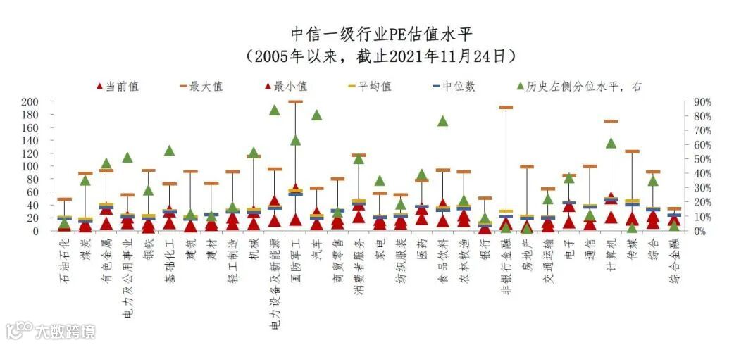 从行业估值来看,当前大多数行业估值低于历史中位数的水平。目前主要处于历史接近最高分位的是周期板块、电新:主要是煤炭、有色、电力、化工、机械,均处于历史较高PE分位数,如果从PB角度来看,采掘/化工/有色/机械分别位于62%/95%/97%/87%分位数;而电力设备及新能源、电子从年初就一直维持在高位,电新更是一直维持在100%的历史估值分位数。目前主要处于历史低位的是大金融板块:从PB角度来看,地产/银行/非银分别处于0%/0%/0%的历史估值分位数。目前虽然高,但回调较多的是食品饮料、医药:从PB角度来看,食品饮料/医药都从6月的97%左右分位数分别下滑到11月的78%/70%,其中食品饮料更是回到了2019年初的分位数,医药则是回到了2020年6月的分位数。