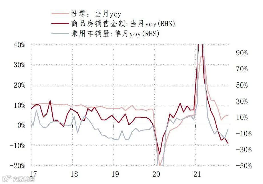 社零数据出现较大压力:国内10月份社零同比增速下降到4.9%,主要是疫情反复,叠加部分地区降雨等自然灾害的影响。其中,餐饮、纺服鞋帽、石油及制品等高社交属性消费品零售额跌入负区间,消费整体增长非常疲弱。目前疫情的反复还在继续,叠加居民增加预防性储蓄应对不确定的宏观环境、消费金融贷款收缩的原因,宏观层面的消费总量数据在2022年Q1可能还会继续承压。
