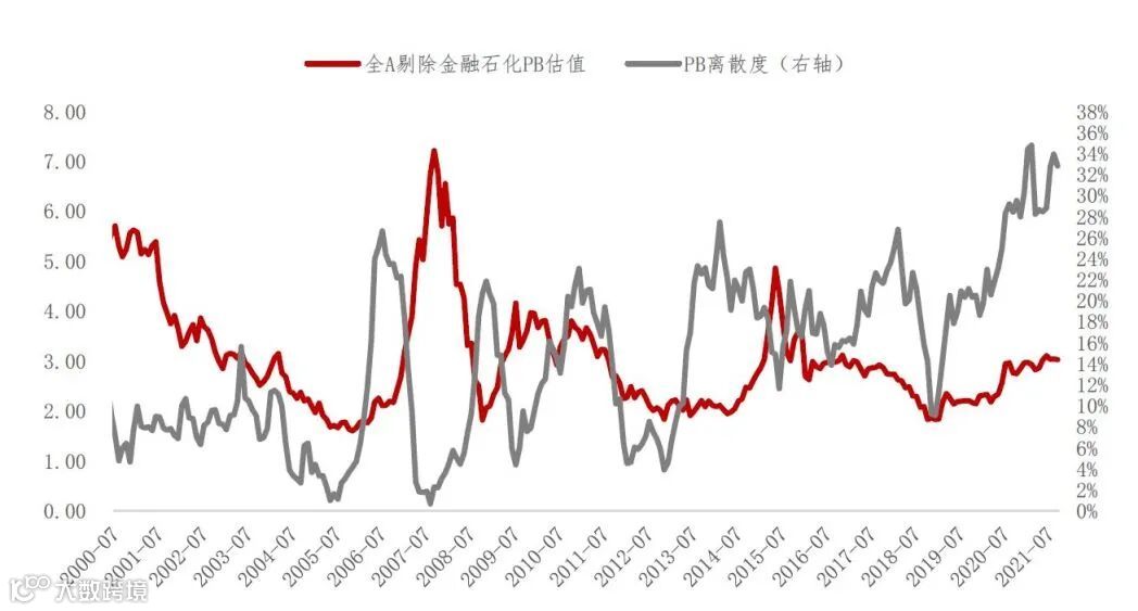 PB的离散度衡量各行业间PB的分化程度,目前仍处高位(PB离散度=各行业PB所处自身历史分位数的方差);市场估值分化正在逐步修复,历史均值是14%,一个标准差是8%,目前基本还在一个标准差以上。但