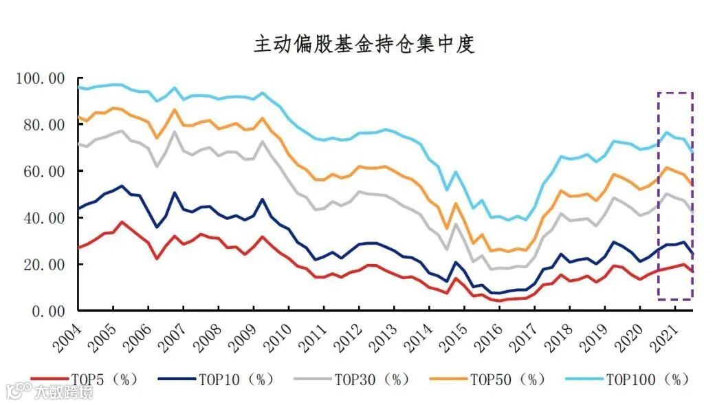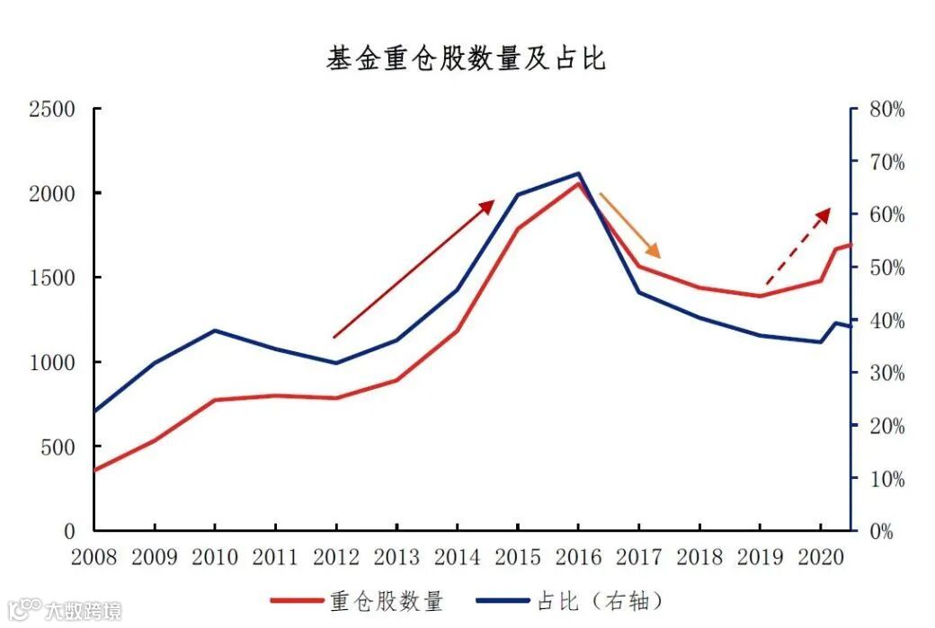 过去,机构仓位集中度持续抬升,基金重仓股数量占全A比例过去几年持续下滑:从茅指数见顶后,基金持仓就开始进行分散化。