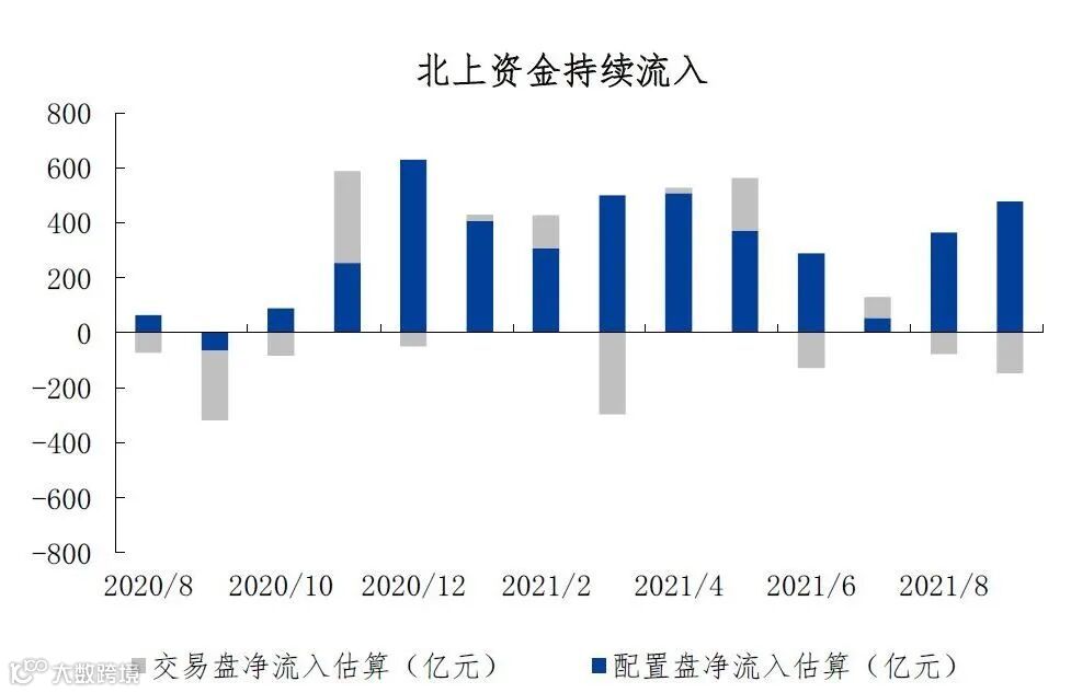 短期市场和风险扰动不改外资长期流入的趋势,外资持续流入A股:截至10月22日,北上净流入达到2907亿元,超过去年全年,配置型外资占据主导,净流入超过3000亿,交易型外资净流出100亿。