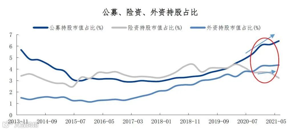 二是机构资金边际推动力量减弱:过去几年,机构力量由弱到强,机构话语权提升,以外资为代表的机构资金在市场中占比大幅提升。但随着市场与机构体量扩容,资金的边际推动力量有所减弱,即使绝对流入金额并未大幅下降,其占A股流动市值比例已经出现小幅回落;公募资金的增长也出现边际放缓。