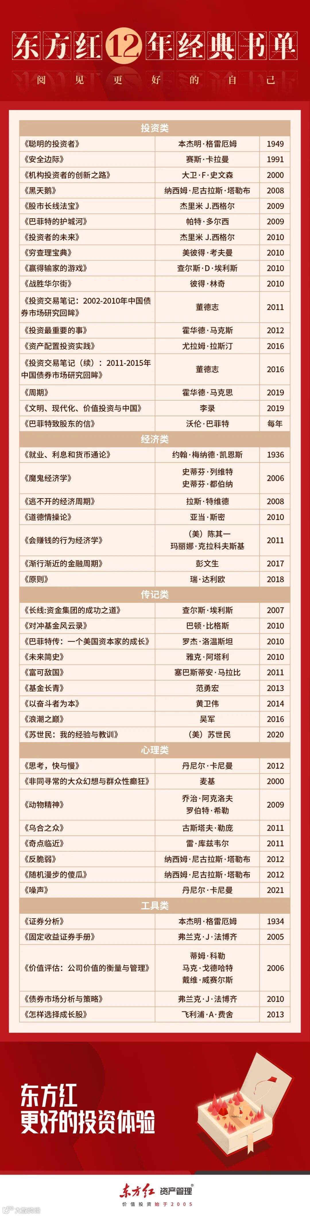 在东方红,阅读是一种习惯,更是一种文化的传承。自2005年东方红品牌初创时起,创始团队就深谙读书和分享之于一家以专业立身的资产管理机构的重要性。阅读的意义在于学而思、思而行的过程,智慧的积累需要大量的研习和实践。投资作为一门“手艺”,知识和经验尤为重要,而读书恰恰是获得知识最简单、直接的途径之一。与此同时,知识的交互与共享能够加速整个“悟道”的进程。投资于个人而言是孤独的,但又是平台力量、集体力量共同作用下的产物。每个人的认知都有边界,但通过充分的分享和智慧的碰撞,或许能够尽量降低木桶中短板造成损失的概率。